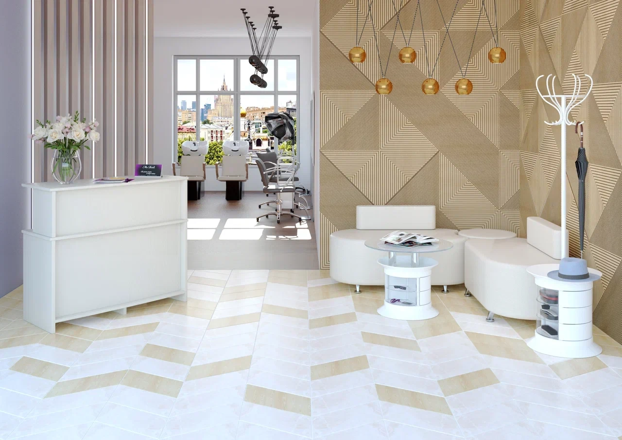 Так, напольное покрытие должно быть износостойким и безопасным, переносить высокую проходимость, контакты с различными косметическими средствами и даже химикатами, которые будут использоваться для дезинфекции. Пол должен быть ровным, без швов, в которых может накапливаться грязь. Отличным выбором становятся ламинат, полимерное покрытие, линолеум или паркет. Блестящее покрытие визуально расширяет пространство.