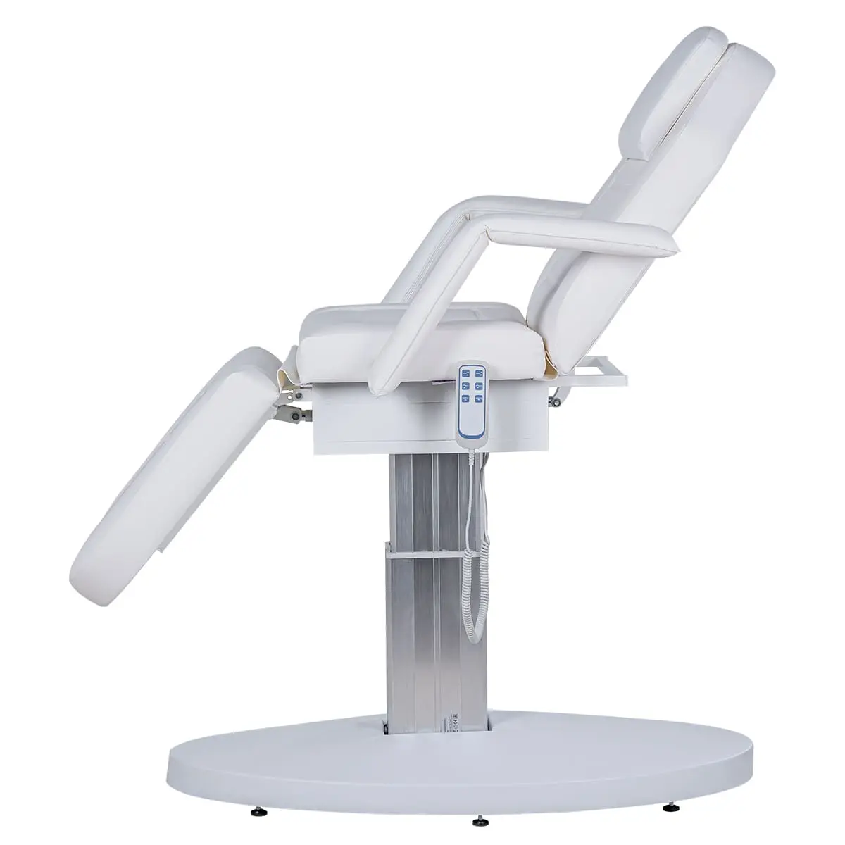 Кресло косметологическое Элегия-03 на колонне (Элегия-2) комплектуется тремя моторами электропривода, которые позволяют быстро и с комфортом для клиента менять положение мягких элементов. Пользуясь регулировками, мастер может трансформировать кресло в горизонтальное положение и использовать его в качестве косметологической или массажной кушетки. Все механические детали аккуратно спрятаны в стильной серебристой колонне. Подлокотники и подушка снимаются. Управление электроприводом осуществляется при помощи удобного пульта, который крепится к каркасу.