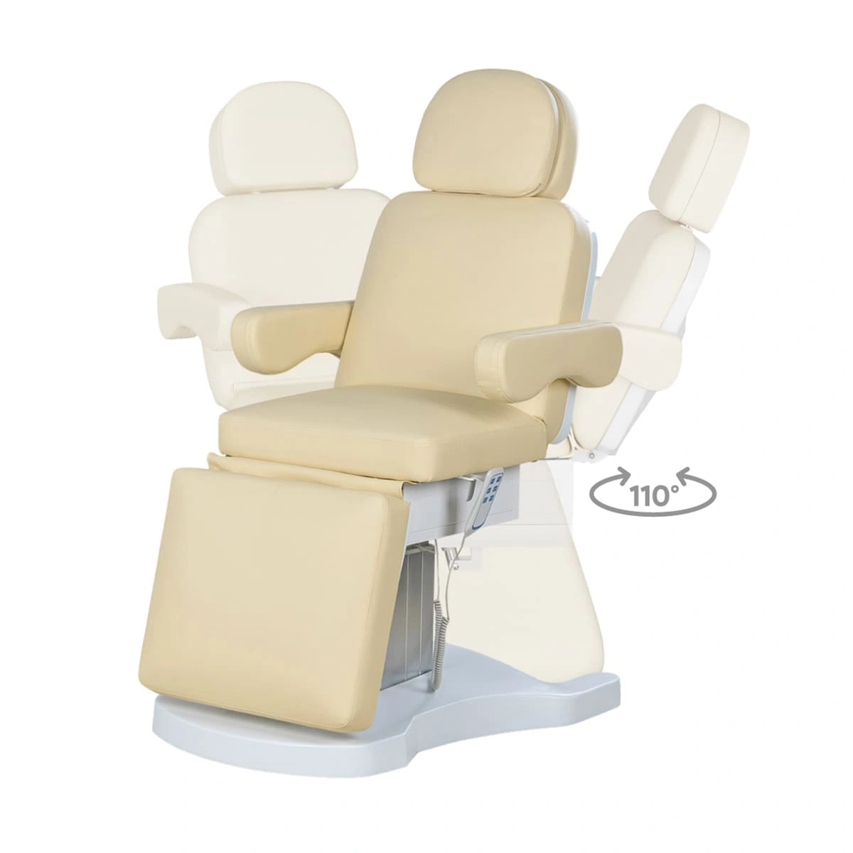 Стильная колонна скрывает все механизмы, а основание с углублением обеспечивает удобный подъезд мастера. Отлично подойдёт для массажей, инъекций и эстетических процедур.