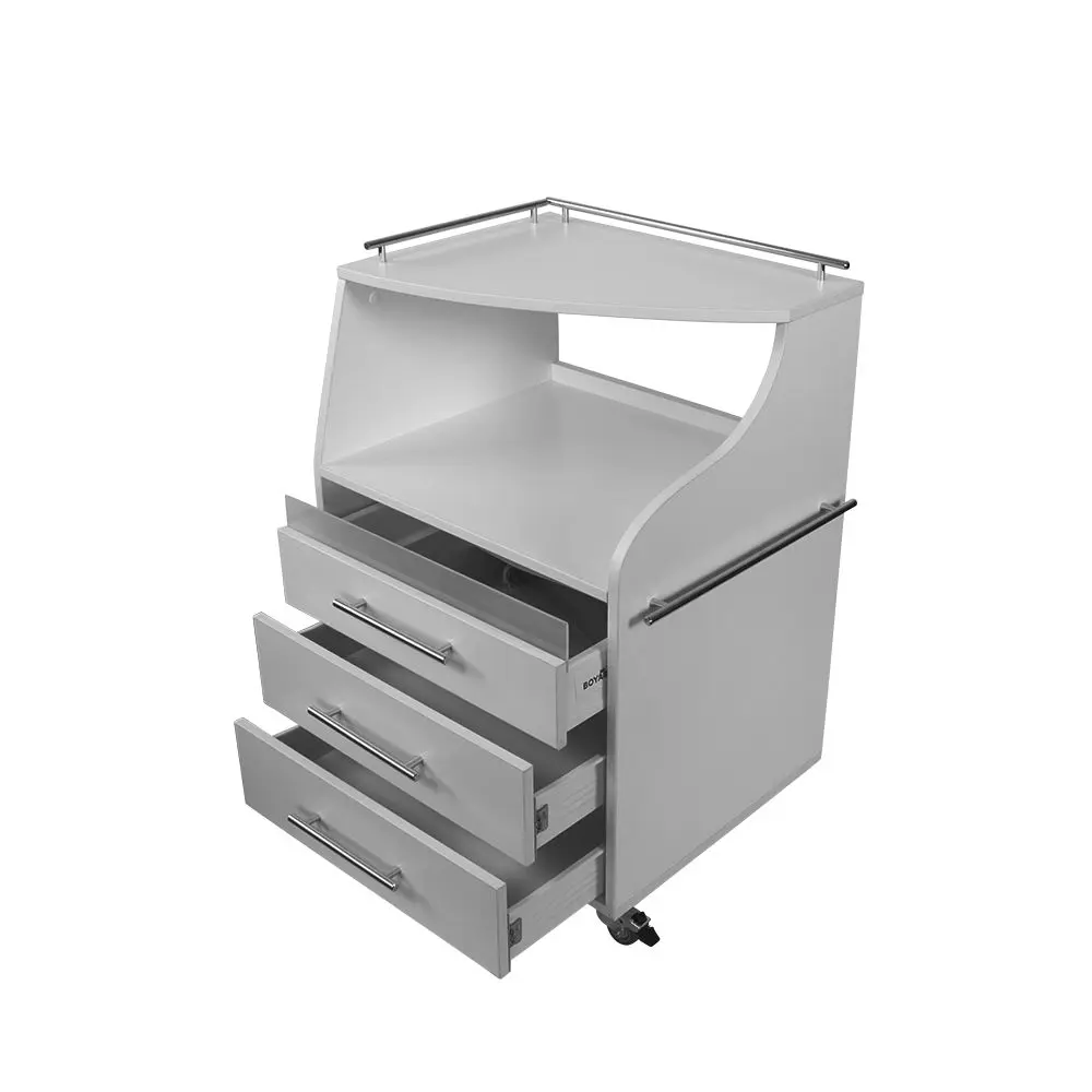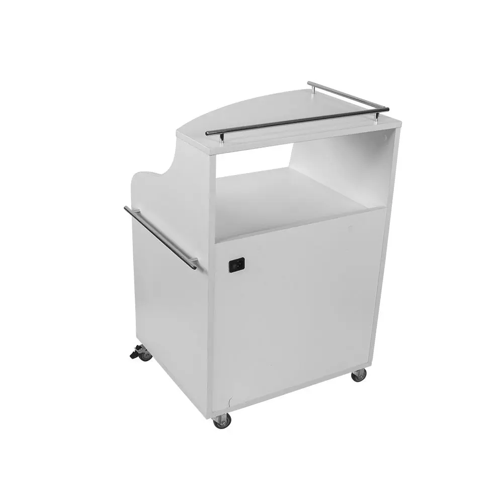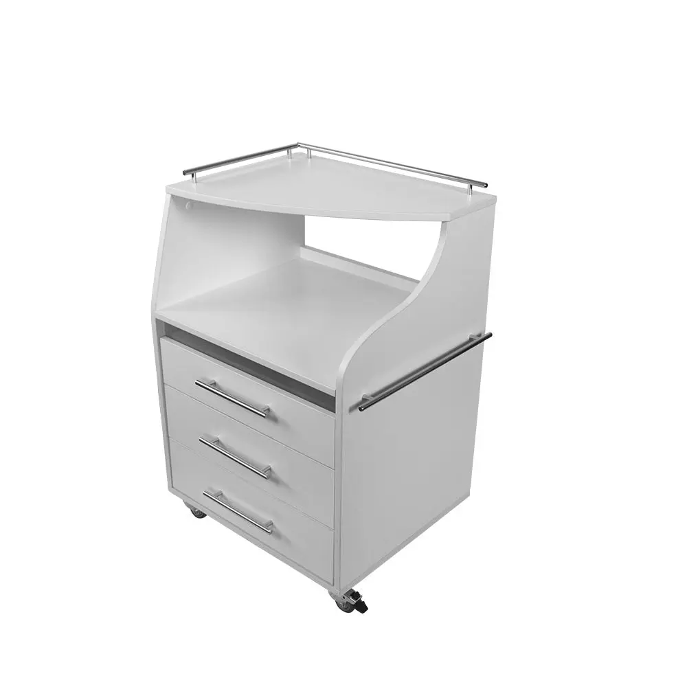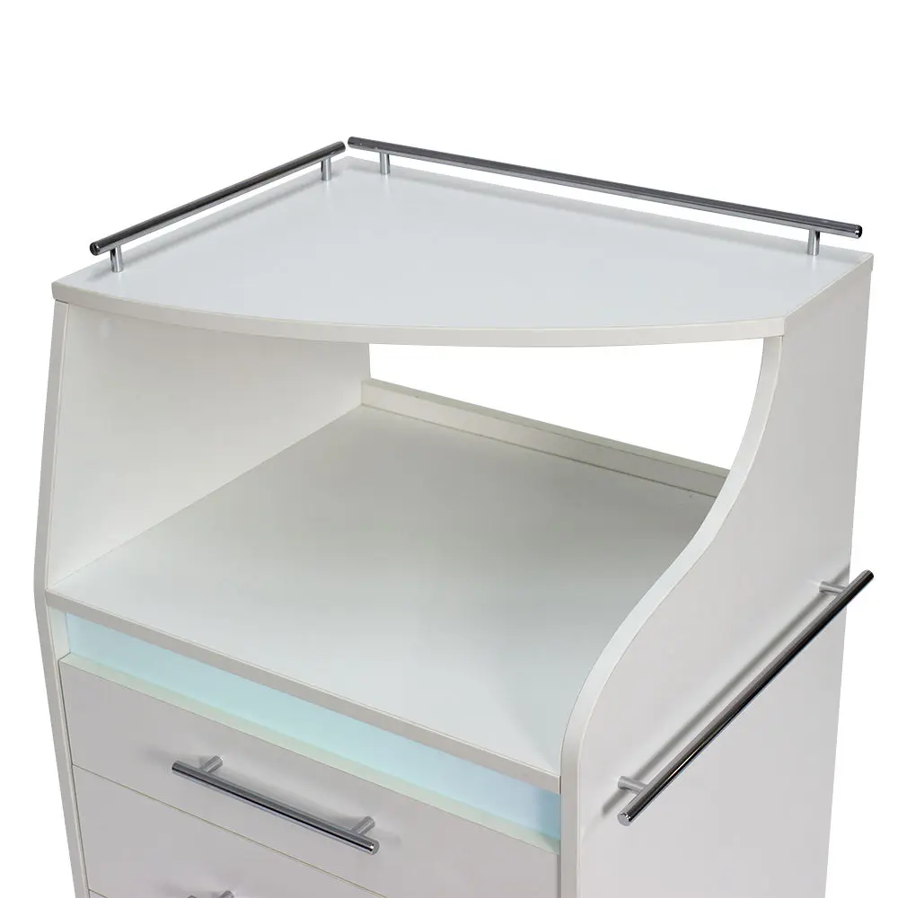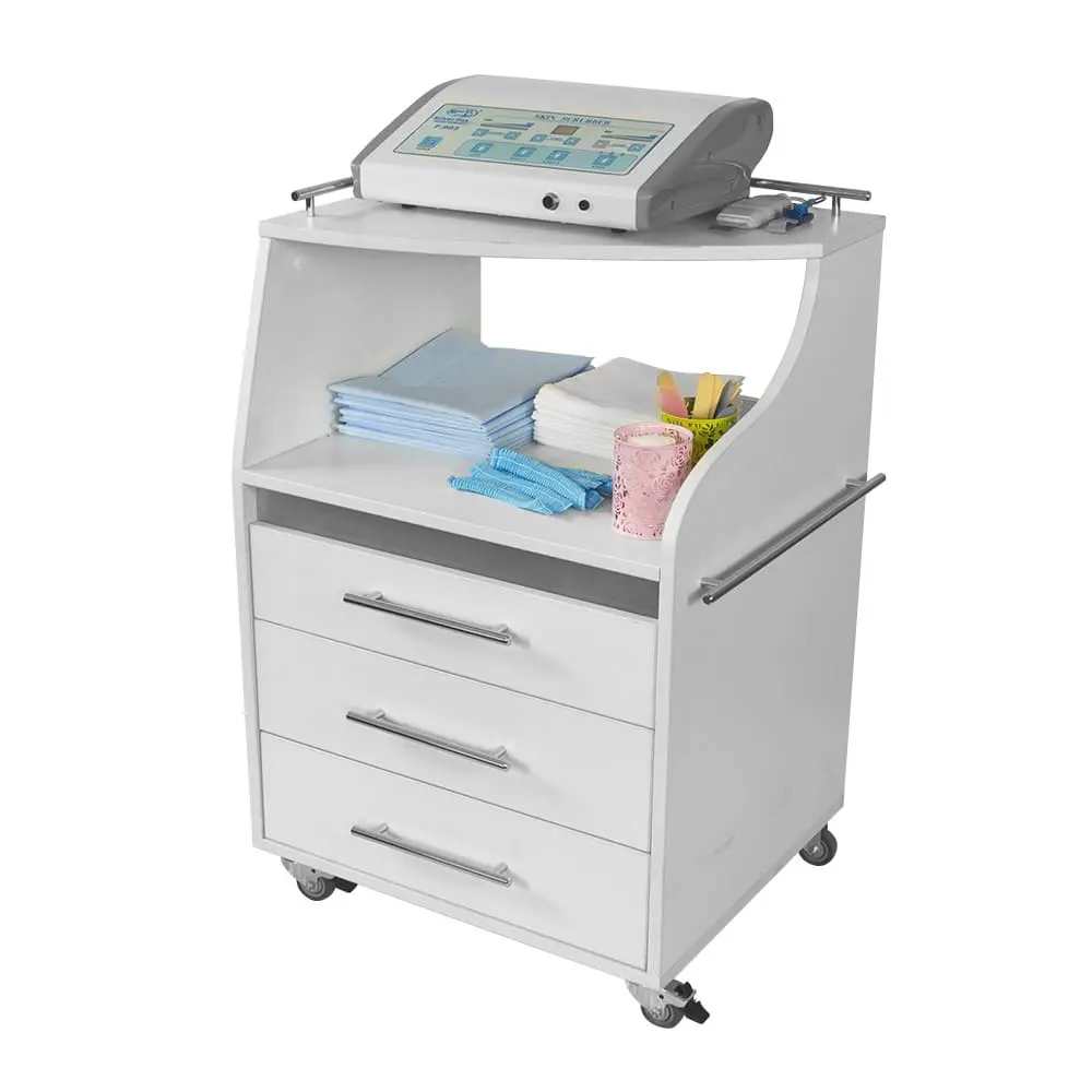 Косметологическая тележка разделена на 3 выдвижных ящика и две полки. Верхний ящик – ультрафиолетовая камера, в которой можно стерилизовать и хранить инструменты. Внутреннее пространство покрыто зеркальным отражателем. В остальных ящиках достаточно места, чтобы разложить приспособления мастера. Верхние полки предназначены для установки аппаратов или принадлежностей первой необходимости. Перемещать косметологическое оборудование можно с помощью вращающихся колес.