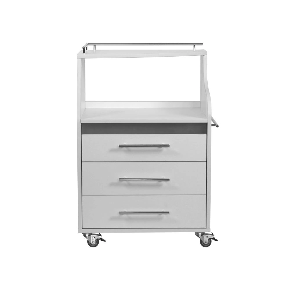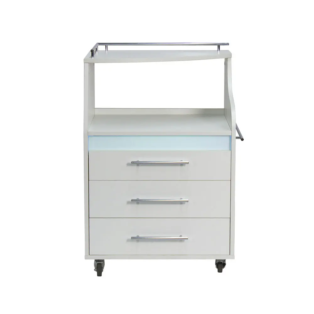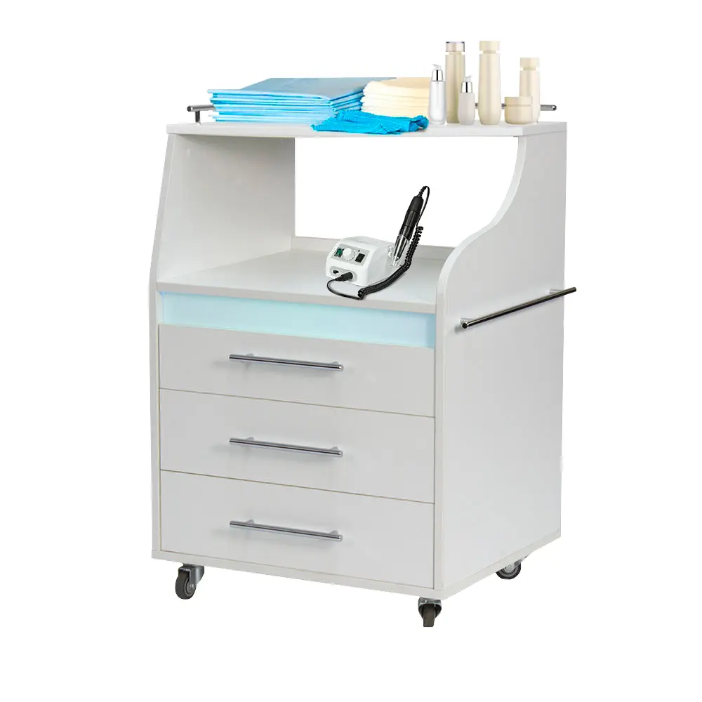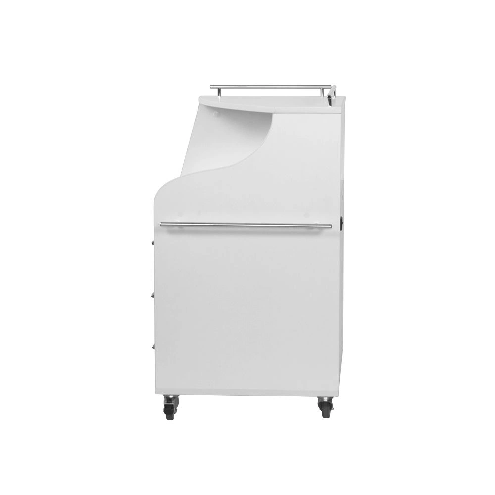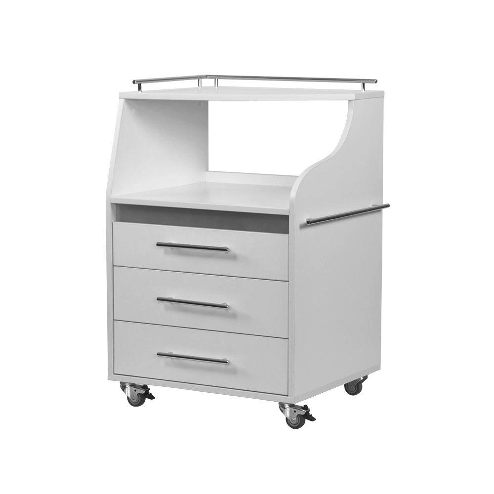 Косметологическая тележка разделена на 3 выдвижных ящика и две полки. Верхний ящик – ультрафиолетовая камера, в которой можно стерилизовать и хранить инструменты. Внутреннее пространство покрыто зеркальным отражателем. В остальных ящиках достаточно места, чтобы разложить приспособления мастера. Верхние полки предназначены для установки аппаратов или принадлежностей первой необходимости. Перемещать косметологическое оборудование можно с помощью вращающихся колес.