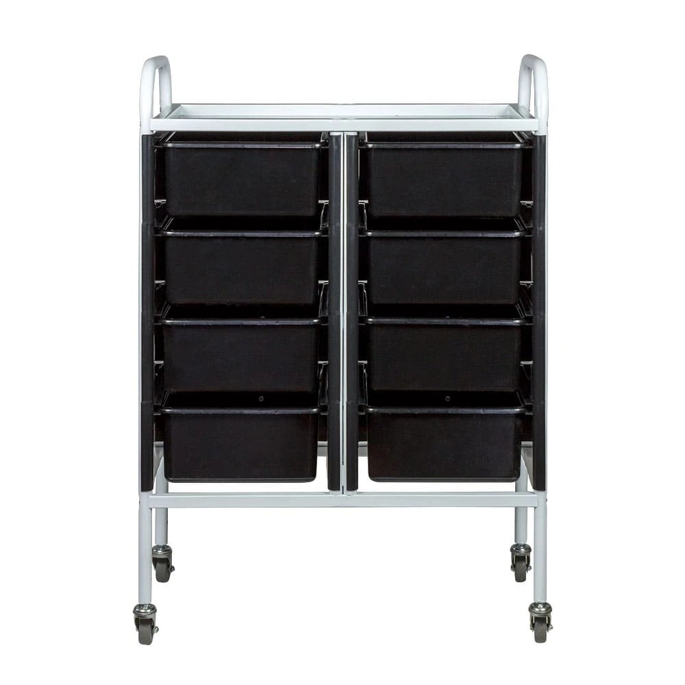 Такое косметологическое оборудование подойдет для организации двух рабочих мест. В распоряжении мастеров 8 выдвижных ящиков для инструментов и расходных материалов. Верхняя полка предназначена для приспособлений, используемых во время проведения процедур. Встроенные маневренные колеса позволят мастеру с легкостью перемещать косметологическое оборудование.