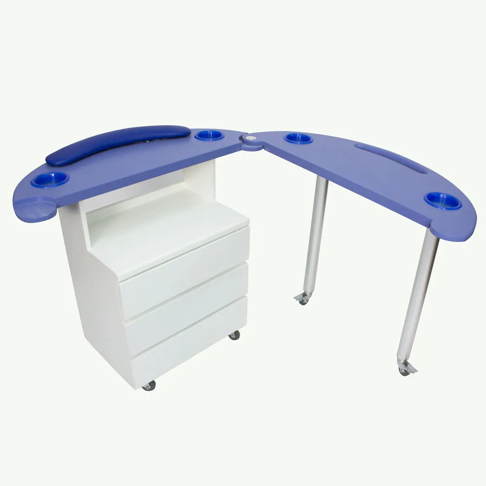 Стол маникюрный МД-9007 (раздвижной) с вместительной тумбой на колесах и хромированными ножками. Он позволяет максимально использовать пространство помещения, что очень важно при минимальной площади рабочего кабинета или для работы на дому. Круглая столешница состоит из двух частей, которые соединены металлическим креплением. В каждой части предусмотрено по два отверстия с пластиковыми емкостями для хранения различных расходных материалов, аксессуаров и прочих рабочих принадлежностей. Для изготовления столешницы применяется ДСП с ламинированным покрытием приятного синего цвета.