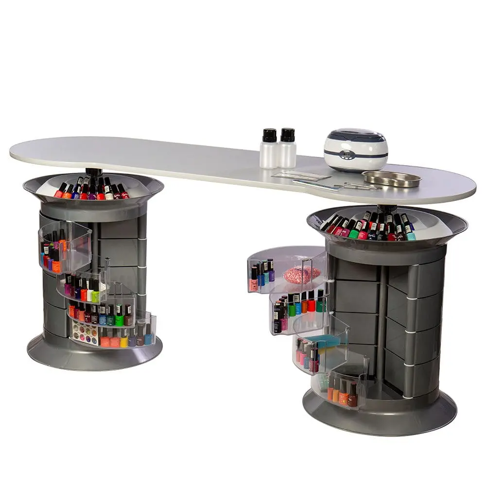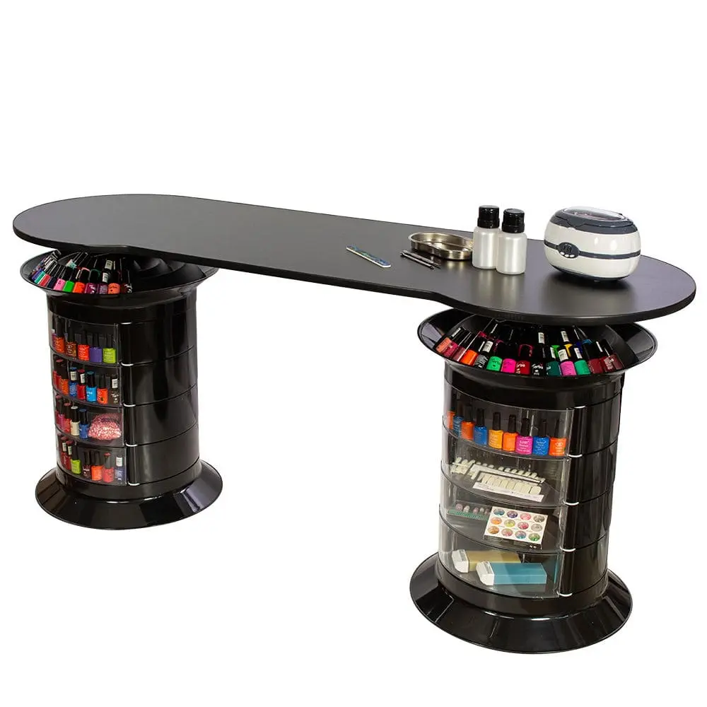 В тумбах 24 ящика, в которых мастер сможет хранить абсолютно все инструменты и расходные материалы. В каждой тумбе есть четыре прозрачных ящичка. Так мастер сможет найти необходимые принадлежности еще быстрей. Крышки над тумбочками разработаны специально для хранения лаков.