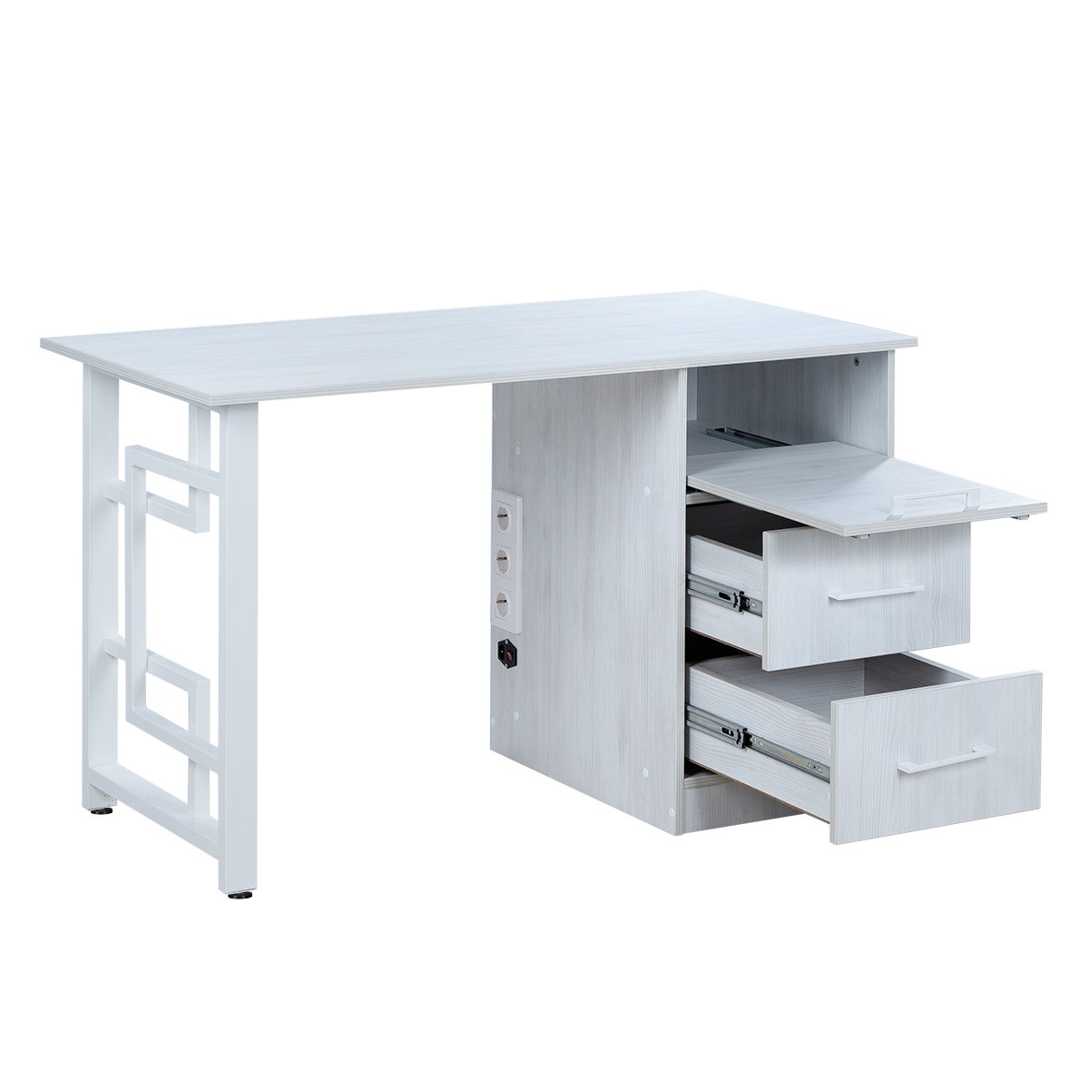 Сбоку расположен функциональный блок: два выдвижных ящика для хранения инструментов и материалов, а также открытая верхняя полочка для часто используемых предметов. Встроенные розетки делают работу мастера удобнее — всё оборудование подключается прямо на месте.