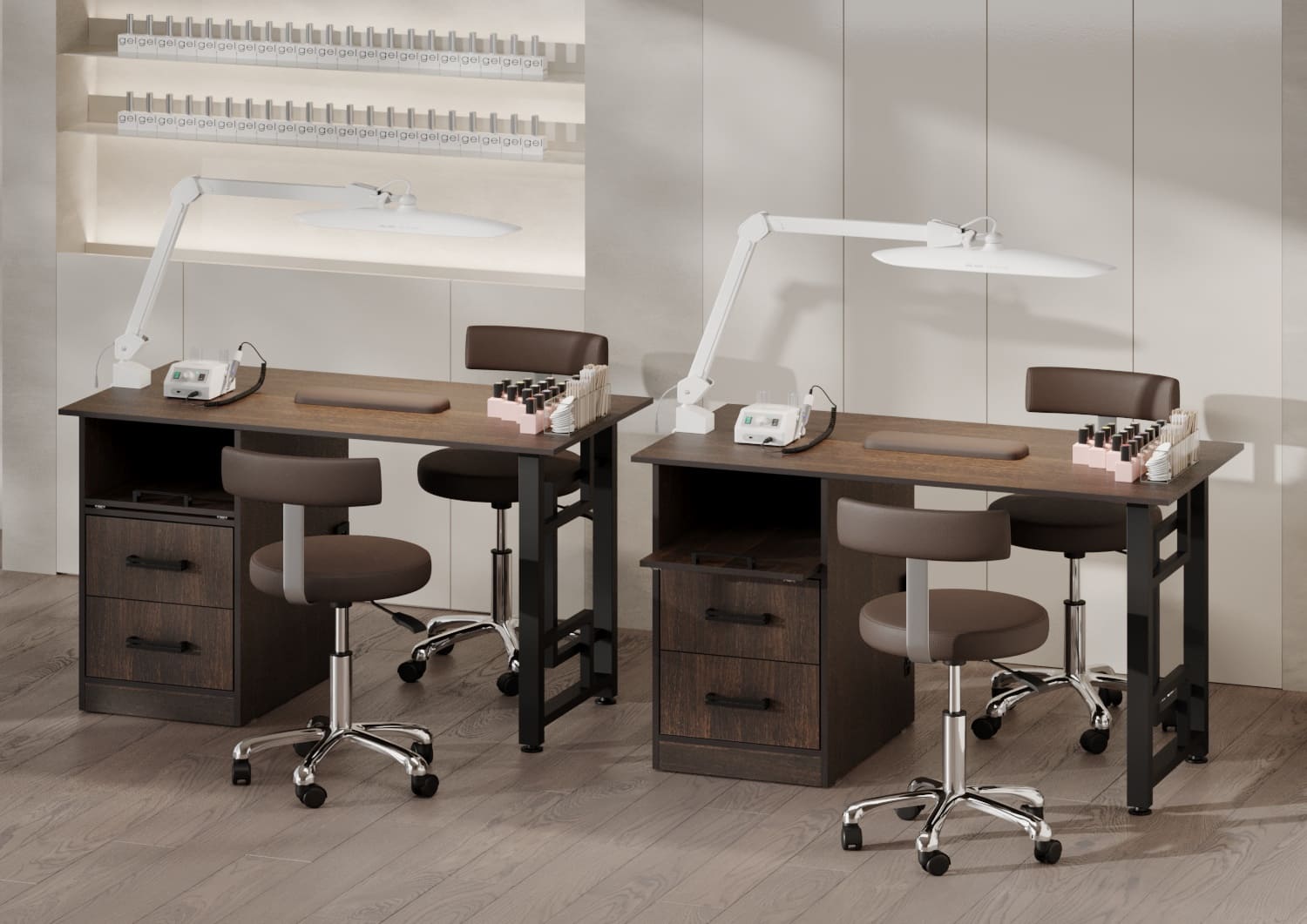 Маникюрный стол Техно в стильном минималистичном дизайне. Столешница устойчива к царапинам и легко очищается, а прочная металлическая опора с геометрическим узором придаёт конструкции стиль и надёжность. Тёмное дерево и чёрный металл создают гармоничное сочетание классики и современности.