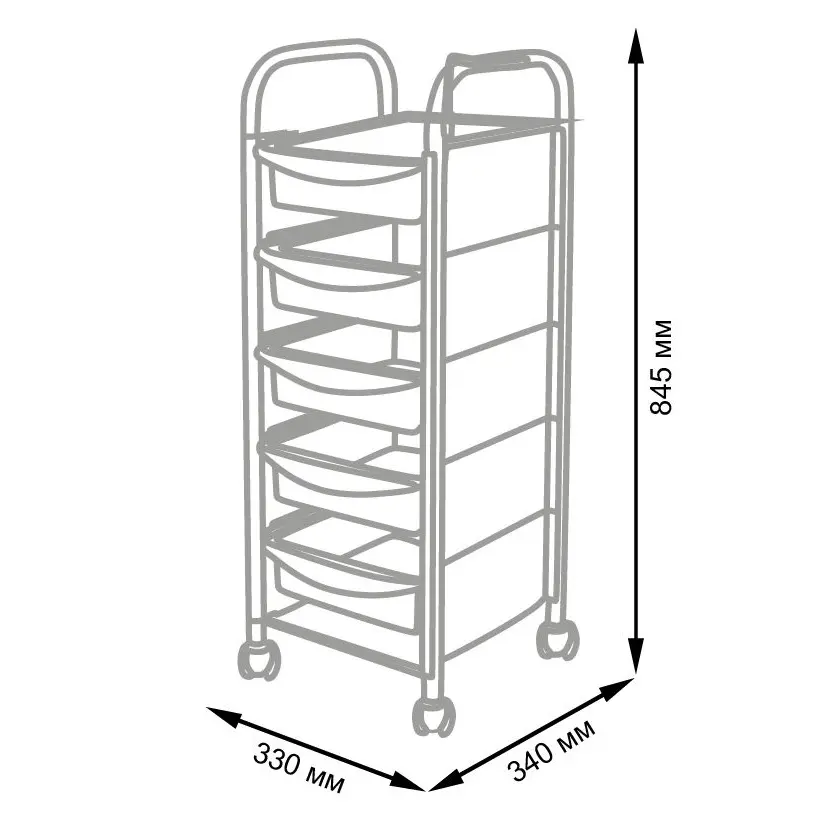 Комплектация: основа из металла, выдвижные ящики (5 штук), поворотные колёсики (4 штуки).