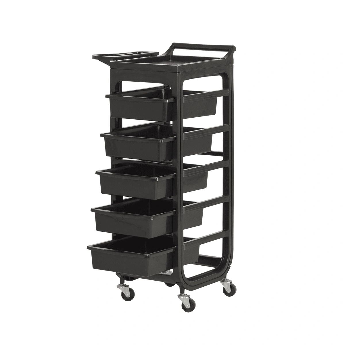 Комплектация: каркас на маневренных колесиках, пять ящиков, верхняя крышка с ручкой для перемещения парикмахерской тележки, боковая полочка с отверстиями для фена, чаши и брашингов. Предусмотрен держатель для фена с отверстиями разного диаметра.