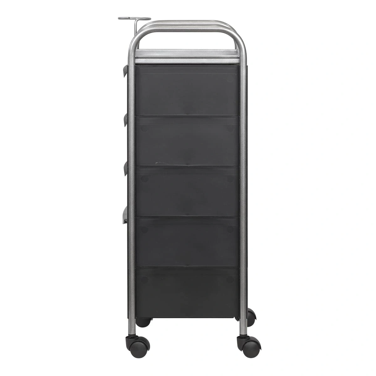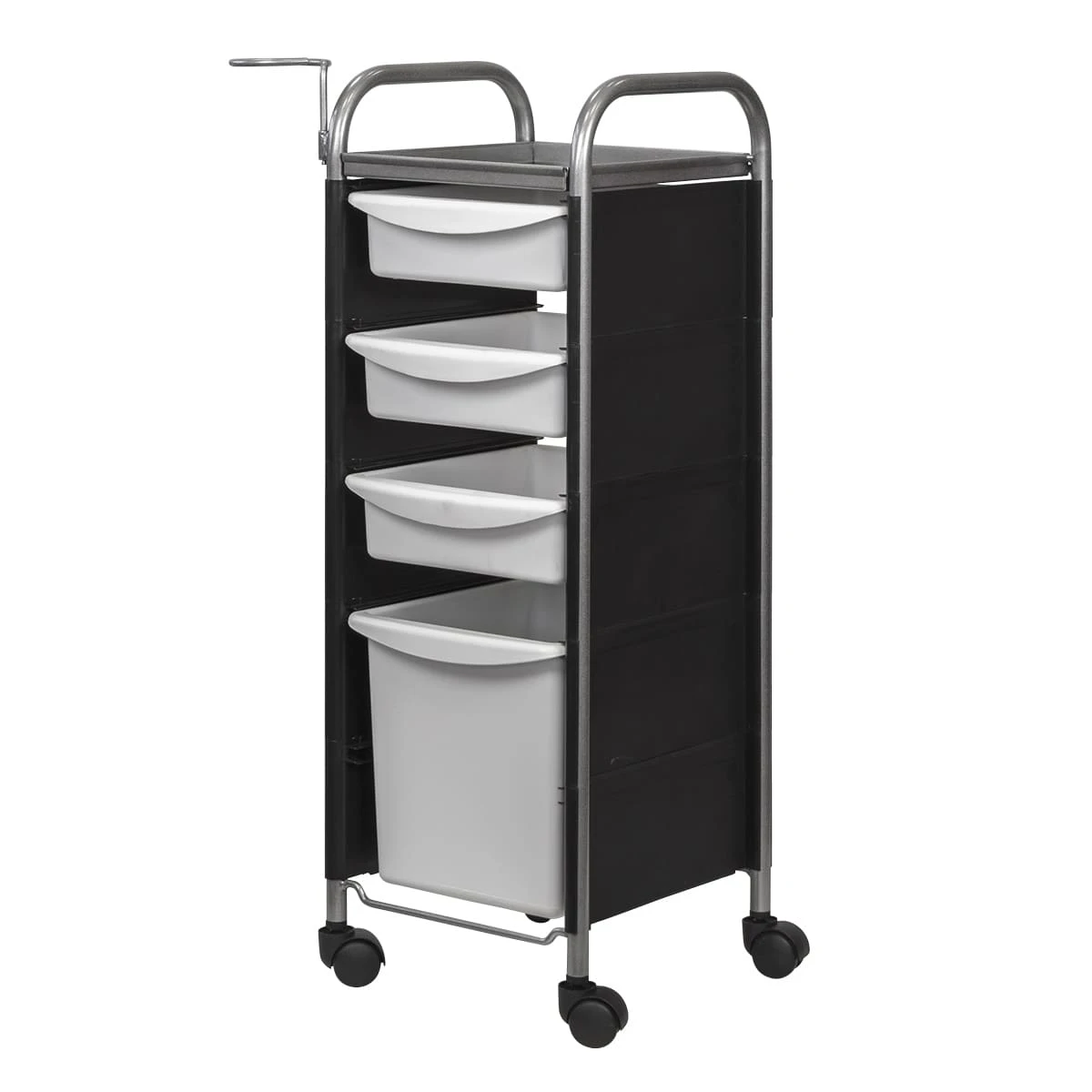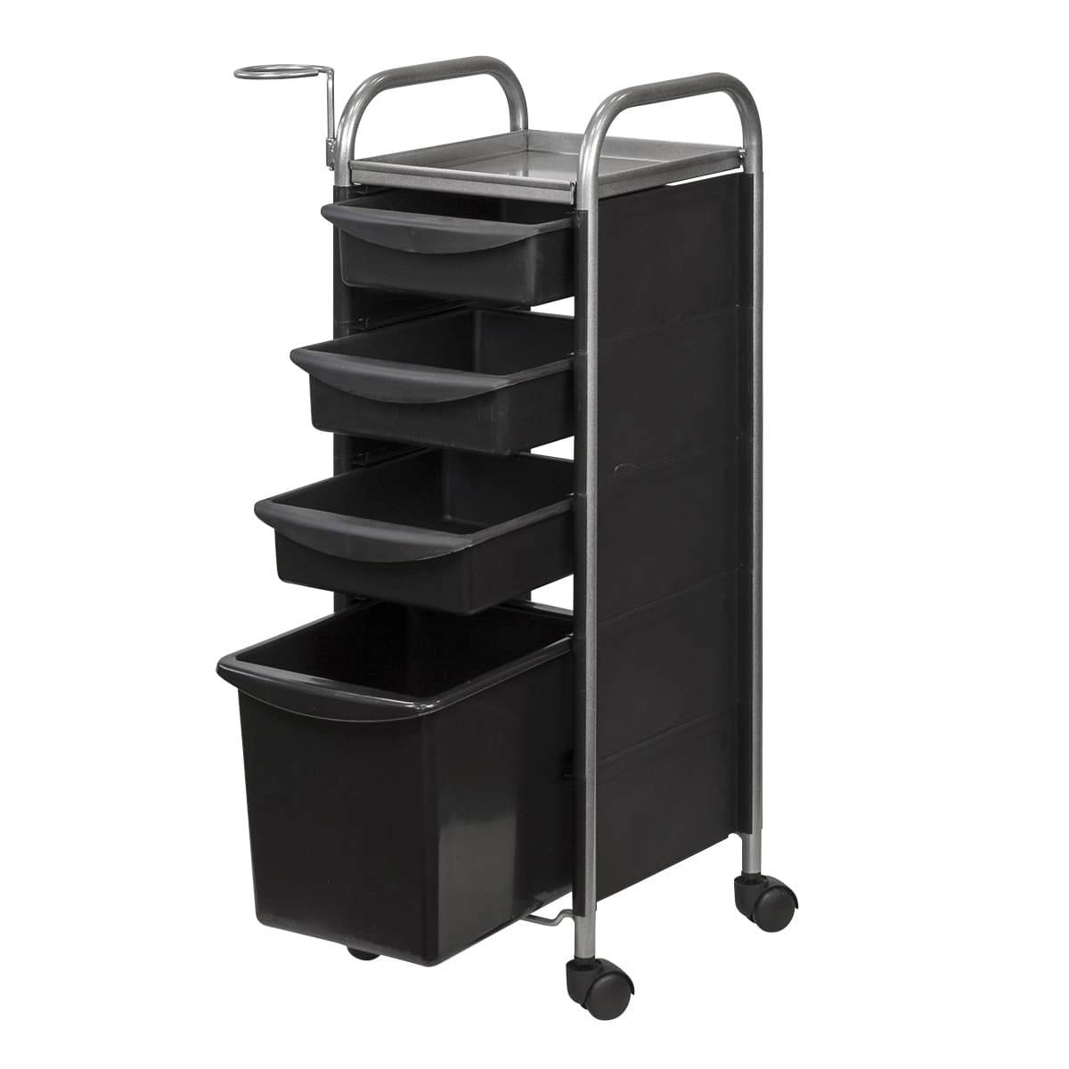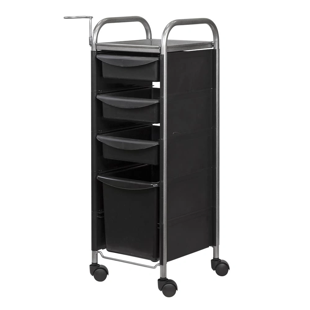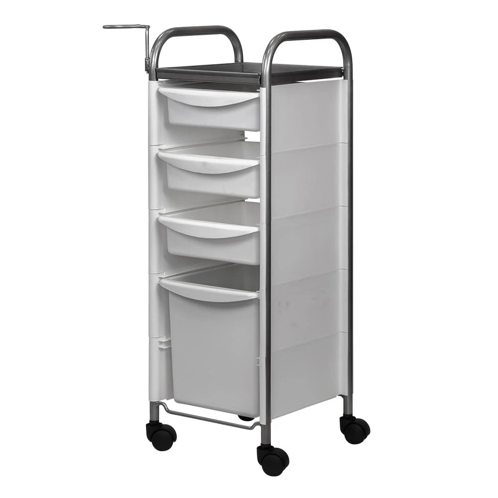 Комплектация: каркас из металла на пластиковых колесах, боковые пластиковые панели, выдвижные ящики, верхняя полка, металлический держатель для фена.