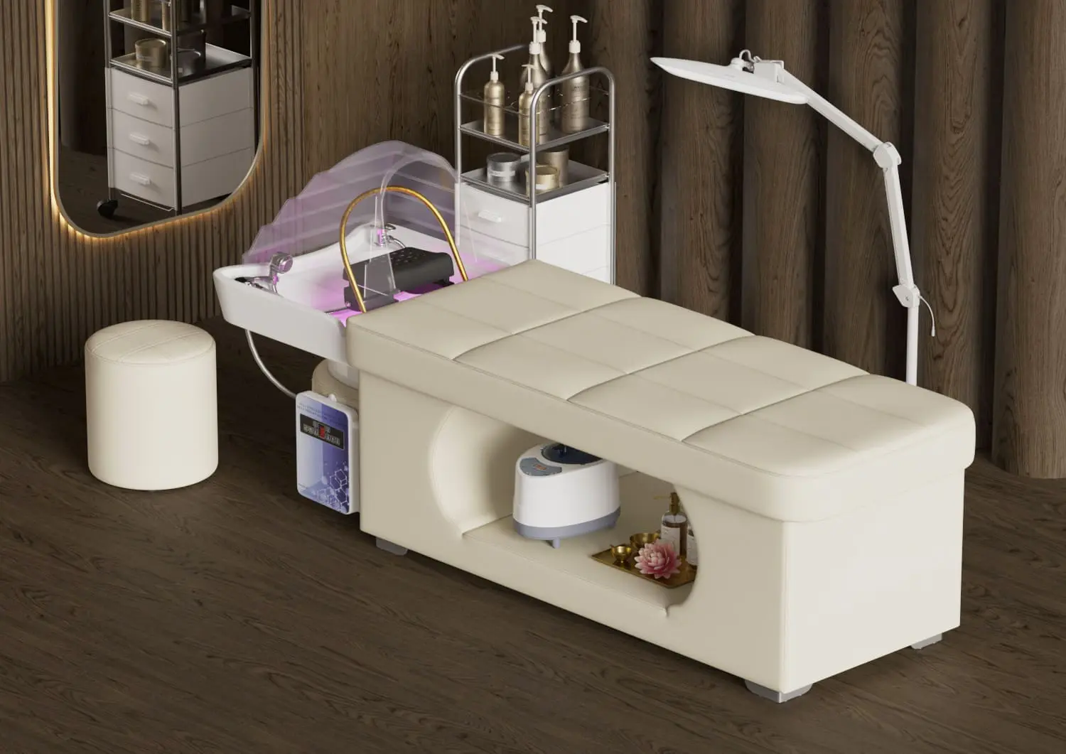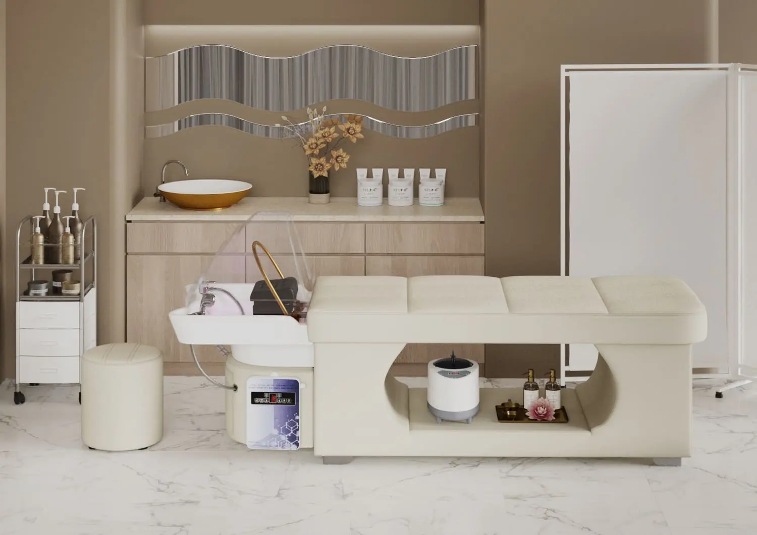 В комплект кушетки для head-spa МД-630 входят: 2 парогенератора, стул мастера и купол для паровой бани — готовое решение для запуска новой популярной услуги.