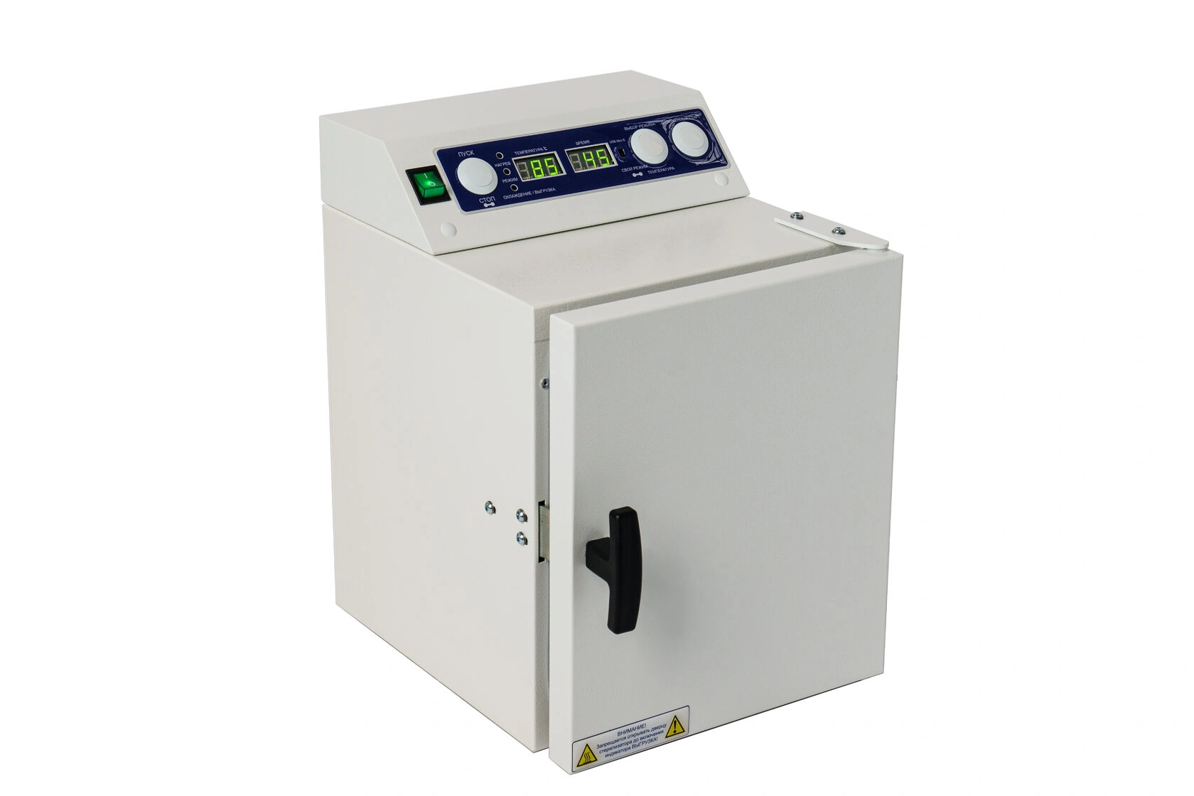 В стерилизаторе "Ферропласт" предусмотрена система звуковой и световой сигнализации режимов работы: